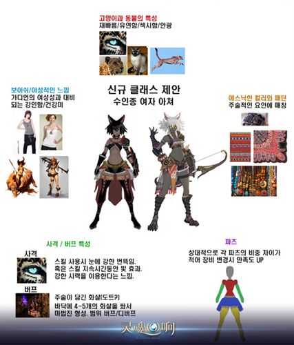 在设定新职业外形之初,所有研发成员的思维定位都较为模糊,他们只知道目前需要一个使用弓箭的远程职业,却对种族选择毫无头绪。这时,有人将兽人弓箭手作为提案上交。这个提案也成为最初的模型,她包含了几个特点,其野蛮靓丽的形象,具备一种野性美,能给人一种强有力及健康美的感受。而且服饰具备名族风格,又略微存有符咒,咒术的感觉。再有就是兽人身手较为矫健,行动迅捷有猫科动物特性。由于久经风霜,她的眼神充满韧性。这些特点拼在一起,就是以下提案草图的模样。